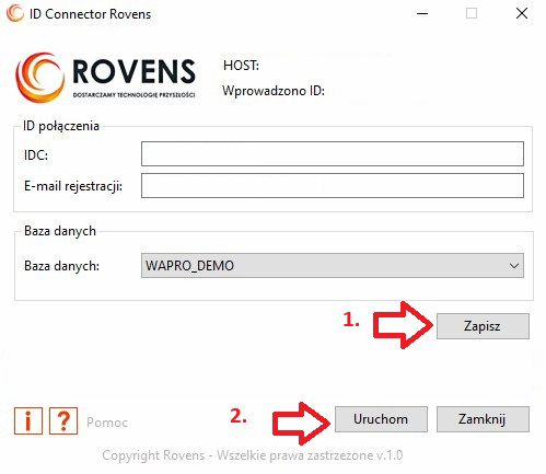 Po wprowadzeniu adresu e-mail oraz ID połączenia, wybierz bazę danych z którą aplikacja będzie się łączyć. Zapisz dane a następnie uruchom połączenie.&#x20;